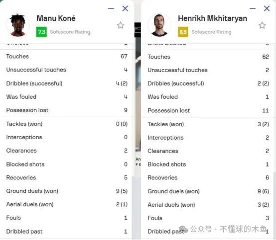 作为对比,罗马中场核心科内本场比赛的状态其实已经相当出色,为球队的攻防转换做出了不少贡献,但与姆希塔良相比,除了创造进球机会外,其他各项关键数据都明显处于下风,无论是过人、抢断、拦截、阻挡射门还是夺回球权,科内的次数都低于姆希塔良,即便是他最引以为傲的对抗能力,无论是对抗总数还是成功率,也都被姆希塔良压制。这足以表明姆希塔良在这场中场对决中展现的比赛硬度和防守态度。